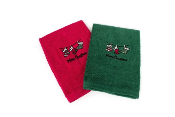 Σετ πετσέτες Χριστουγεννιάτικες 2 τεμ. με ανεξίτηλα χρώματα και κεντημένο σχέδιο που απεικονίζει γιορτινές κάλτσες, ιδανικό για δώρο που περιέχει που περιέχει: 2 πετσέτες χειρός, διαστάσεων 40X60, μία σε κόκκινο και μία σε πράσινο χρώμα. Οι πετσέτες είναι κατασκευασμένες από 100% βαμβάκι έξτρα απαλό και απορροφητικό και είναι ελεγμένες για επιβλαβείς ουσίες με το αναγνωρισμένο παγκοσμίως πιστοποιητικό, OEKO TEX® Standard 100. Συσκευασία δώρου με γιορτινή κορδέλα.
