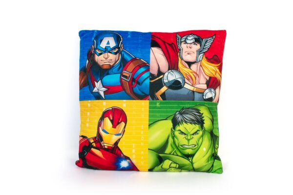 Βελούδινο διακοσμητικό μαξιλάρι διαστάσεων 38X38cm, με σχέδιο ψηφιακής εκτύπωσης και στις δύο πλευρές, που απεικονίζει την αγαπημένη ομάδα ηρώων της Marvel, τους Avengers (Iron Man, Captain America, Hulk, Thor). Κατασκευασμένο από 100% Velboa (Faux Fur) ύφασμα, κάτι που το καθιστά πολύ απαλό και μαλακό και προσδίδει βελούδινη υφή. Συσκευασία Polybag.