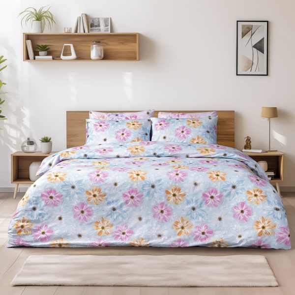 Σετ παπλωματοθήκη Blume από την εταιρεία Lino Home! Το σετ παπλωματοθήκη Blume έχουν ένα λουλουδάτο σχέδιο σε ποικιλία αποχρώσεων, όπως ροζ, πορτοκαλί, κίτρινο και γαλάζιο σε ανοιχτό μπλε φόντο. Τα λουλούδια είναι ομοιόμορφα κατανεμημένα στην επιφάνεια, προσφέροντας ένα ζωηρό και φρέσκο στυλ στα σεντόνια. Όλα τα τεμάχια του σετ είναι κατασκευασμένα από σύμμικτο ύφασμα σύνθεσης 80% βαμβάκι και 20% πολυέστερ, χαρακτηριστικό που δίνει μια ευχάριστη αίσθηση στον ύπνο!