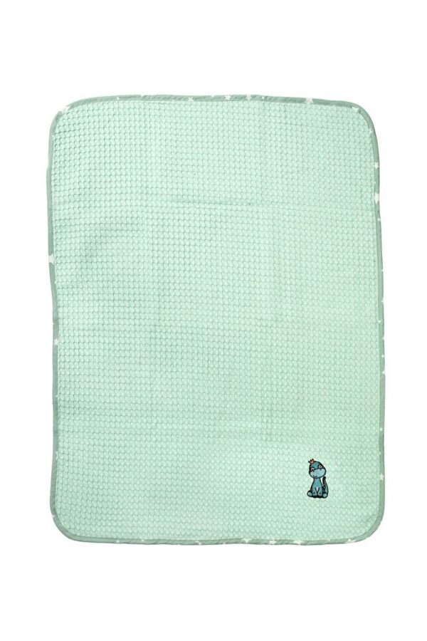 Βρεφική κουβέρτα πικέ κούνιας με ανάγλυφο σχέδιο βάφλα, χρώματος μέντας, διαστάσεων 100 x 160 cm, διακοσμημένη με χαριτωμένο κέντημα δεινοσαυράκι και χρωματιστό ρέλι με μοτίβο αστεράκια. Κατασκευασμένη από 100% βαμβακερό, υποαλλεργικό woven πικέ ύφασμα βάρους 325 gr/m². Χάρη στην εξαιρετικά απαλή υφή της, αγκαλιάζει το μωρό σας με άνεση, ενώ η ιδιαίτερη ύφανση βάφλα επιτρέπει στο δέρμα να αναπνέει, καθιστώντας την ιδανική επιλογή για την άνοιξη και το καλοκαίρι. Συσκευασία δώρου: κουτί πολυτελείας. Η κουβέρτα είναι ελεγμένη για επιβλαβείς ουσίες με το παγκοσμίως αναγνωρισμένο πιστοποιητικό OEKO-TEX® Standard 100.