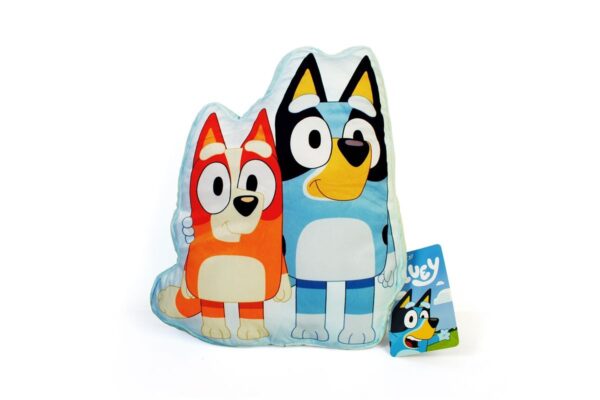 Τρισδιάστατο μαξιλαράκι ύψους 40 cm, με σχέδιο ψηφιακής εκτύπωσης που απεικονίζει τις αγαπημένες αδερφές Bluey και Bingo της σειράς των Ludo & BBC Studios, Bluey. Κατασκευασμένο από 100% Velboa (Faux Fur) ύφασμα, κάτι που το καθιστά πολύ απαλό και μαλακό και προσδίδει βελούδινη υφή. Συσκευασία Polybag.