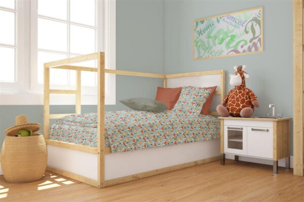 Βρεφική παπλωματοθήκη, διαστάσεων 120X160 cm, για παπλωματάκι κούνιας, με φερμουάρ. Κατασκευασμένη από απαλό 100% βαμβακερό ύφασμα 144 κλωστών, με χαρούμενα χρώματα και μοντέρνες βρεφικές παραστάσεις. Κατασκευάζεται στην Ελλάδα. Συσκευασία PVC bag.