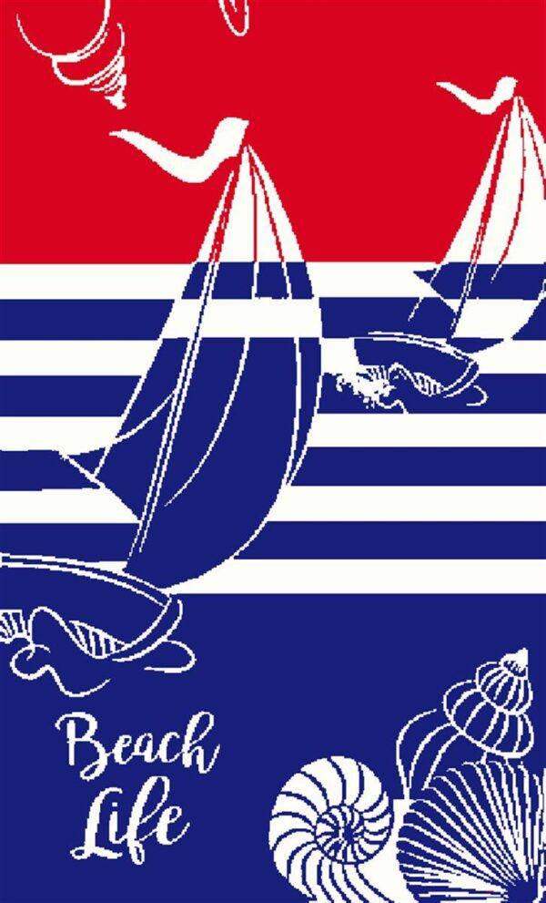 Βελουτέ πετσέτα θαλάσσης, διαστάσεων 87X165 cm, με ζακάρ σχέδιο διπλής όψεως που απεικονίζει ιστιοφόρα, σε μπλε και κόκκινο χρώμα. Κατασκευασμένη από 100% αιγυπτιακό βαμβάκι, υψηλής απαλότητας και απορροφητικότας, βάρους 420 gr/m². Συσκευασία Polybag.