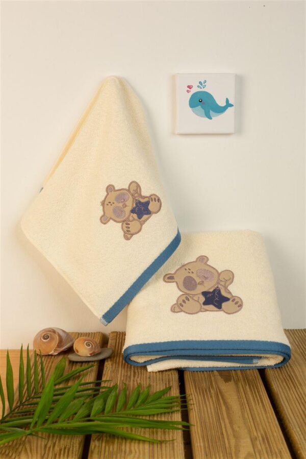 Σετ βρεφικές πετσέτες μπάνιου που περιέχει : 1 τεμάχιο πετσέτα χειρός διαστάσεων 30X50 cm και 1 τεμάχιο πετσέτα μπάνιου διαστάσεων 70X140 cm.Οι πετσέτες έχουν χρωματιστή υφασμάτινη φάσα και σχέδιο με κέντημα και είναι κατασκευασμένες από 100% βαμβάκερη πετσέτα 400 gsm, υψηλής απορροφητικότητας. Συσκευασία Δώρου Κουτί Πολυτελείας.