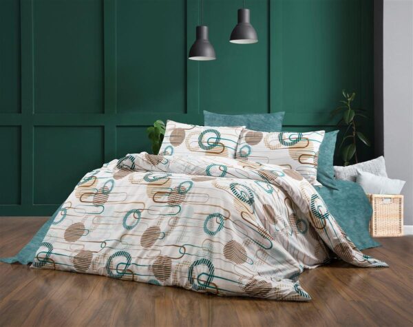Σετ σεντόνια 4 τεμαχίων για υπέρδιπλο στρώμα που περιέχει: 2 τεμ. flat σεντόνια διαστάσεων 220X240 cm και 2 τεμ. μαξιλαροθήκες διαστάσεων 50X70 cm. Κατασκευασμένα από ύφασμα σύνθεσης 70% βαμβάκι – 30% Polyester, 144 TC, με χαρούμενα μοντέρνα χρώματα και σύγχρονες παραστάσεις με εμπριμέ σχέδιο στο πανωσέντονο και κομποζέ Petrol Shadow κατωσέντονο για να αισθάνεστε την υπεροχή στο κρεβάτι σας. Κατασκευάζεται στην Ελλάδα. Συσκευασία Box Polybag.