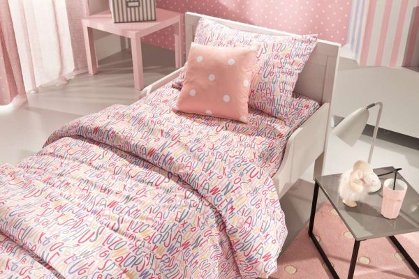 Σετ σεντόνια 3 τεμαχίων από 100% βαμβάκι, αποτελούμενο από κατωσέντονο 160×250εκ., πανωσέντονο 160×250εκ. και μαξιλαροθήκη 50×70εκ. Ολοκληρώστε το παιδικό σετ με τα υπόλοιπα προϊόντα της σειράς Letters Pink.