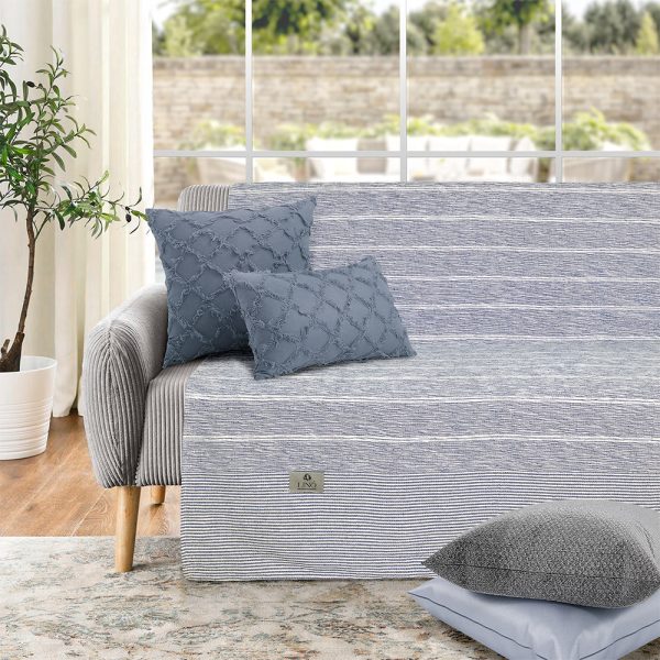 Ριχτάρι βαμβακερό Convio της καλοκαιρινής συλλογής Lino Home. Το ριχτάρι είναι κατασκευασμένο από 90% βαμβάκερό & 10% πολυεστερικό ύφασμα με προδιαγραφές χειροποίητης ύφανσης. Η βαμβακερή του ποιότητα, το καθιστά ιδιαίτερο δροσερό, κατάλληλο για τους ζεστούς καλοκαιρινούς μήνες αλλά μπορεί ακόμα να σταθεί στο σαλόνι σας ως 4season ριχτάρι. Η μποέμ εμφάνισή του και το casual στυλ του, με τη φαρδιά ρίγα σε όλη την έκταση και τις λεπτές, συγκεντρωμένες ρίγες σαν φάσα στο τελείωμα του, κάνουν την καθημερινή χρήση του ριχταριού Convio ιδανική.