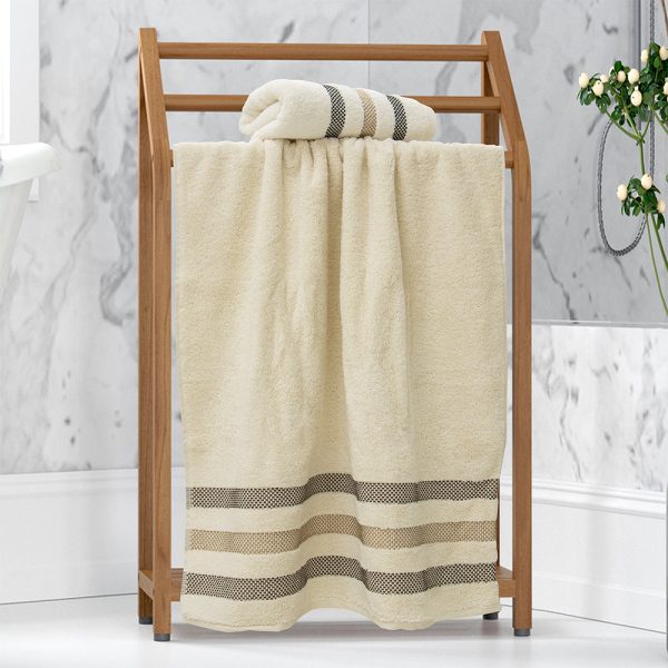 Πετσέτα Baho της εταιρείας Lino Home! Η πετσέτα Baho είναι κατασκευασμένη από υψηλής ποιότητας βαμβάκι πενιέ, βάρους 600gsm/m2, που προσφέρει εξαιρετική απαλότητα και απορροφητικότητα. Διαθέτει off white βάση ενώ τη διακοσμούν υφαντές ρίγες σε μπεζ-καφέ αποχρώσεις, οι οποίες δημιουργούν κομψό γεωμετρικό σχέδιο. Η πετσέτα baho είναι ιδανική για καθημερινή χρήση, προσφέροντας πολυτέλεια και αντοχή.