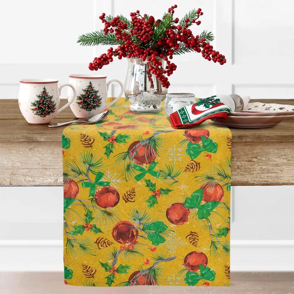 Εμπριμέ τραβέρσα Kaliady από την εταιρεία Lino Home. Η τραβέρσα Kaliadyέχει χαρούμενο χριστουγεννιάτικο μοτίβο με χριστουγεννιάτικες μπάλες, γκι και φιόγκους σε χρυσό φόντο ενώ είναι κατασκευασμένη από σύμμικτο βαμβακερό ύφασμα για ευκολία στη χρήση και να στολίζει όμορφα το γιορτινό τραπέζι! Τα χρώματα και τα σχέδια στην τραβέρσα Kaliady της εταιρείας Lino Home είναι αποτέλεσμα Eco Digital Printing, τεχνική που τα καθιστά ζωηρά και ανεξίτηλα στο χρόνο και τη χρήση. Η τραβέρσα είναι ένα προϊόν που εκτός από το να διακοσμεί και να δίνει μοναδική αισθητική στο χώρο καθώς μπορεί να τοποθετηθεί στο τραπέζι είτε μόνη της ως κύριο διακοσμητικό στοιχείο είτε πάνω από κάποιο τραπεζομάντηλο. Τις φετινές γιορτές ντύστε την τραπεζαρία και την κουζίνα σας με μοναδικά και ξεχωριστά χριστουγεννιάτικα προϊόντα από την εταιρεία Lino Home.